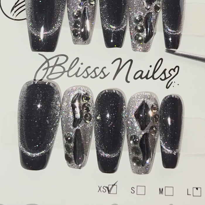 Blisss Nails Handmade Black Glitter Ombre with Cat Eye Effect Press On Nails – Long Coffin Reusable Artificial Fake Nails with Rhinestones & Chrome Accents | Premium Luxury Nail Art 10 pc Nails Set - S