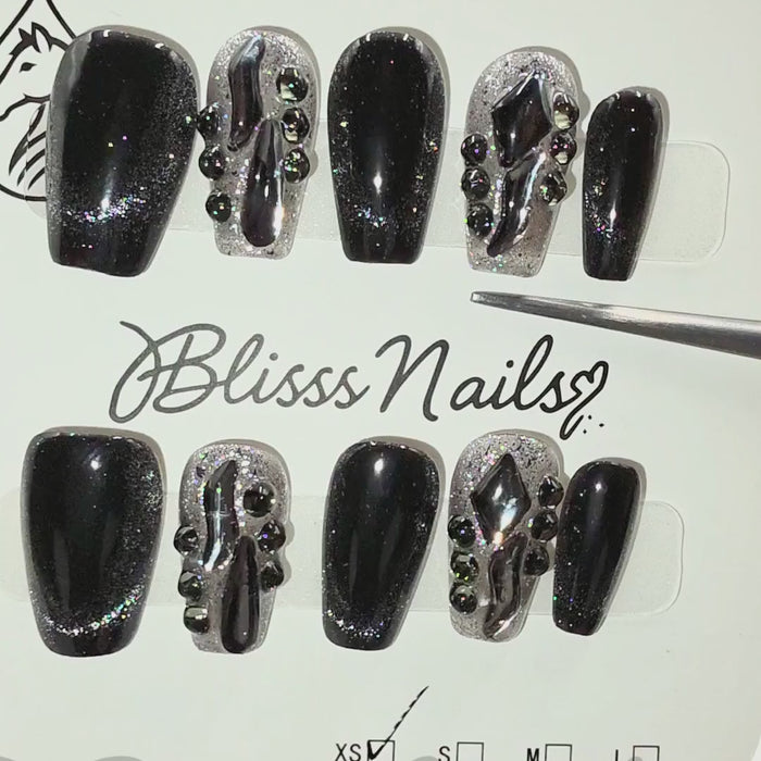 Blisss Nails Handmade Black Glitter Ombre with Cat Eye Effect Press On Nails – Short Coffin Reusable Artificial Fake Nails with Rhinestones & Chrome Accents | Premium Luxury Nail Art 10 pc Nails Set - S