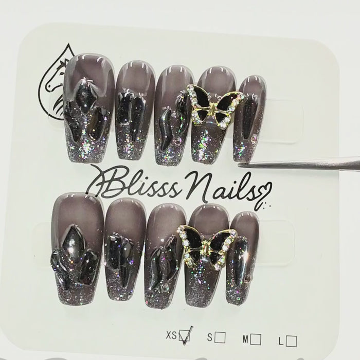 Blisss Nails Handmade Black Ombre Glitter Press On Nails – Long Coffin Reusable Artificial Fake Nails with 3D Butterfly Charm | Premium Luxury Nail Art 10 pc Nail Set - S
