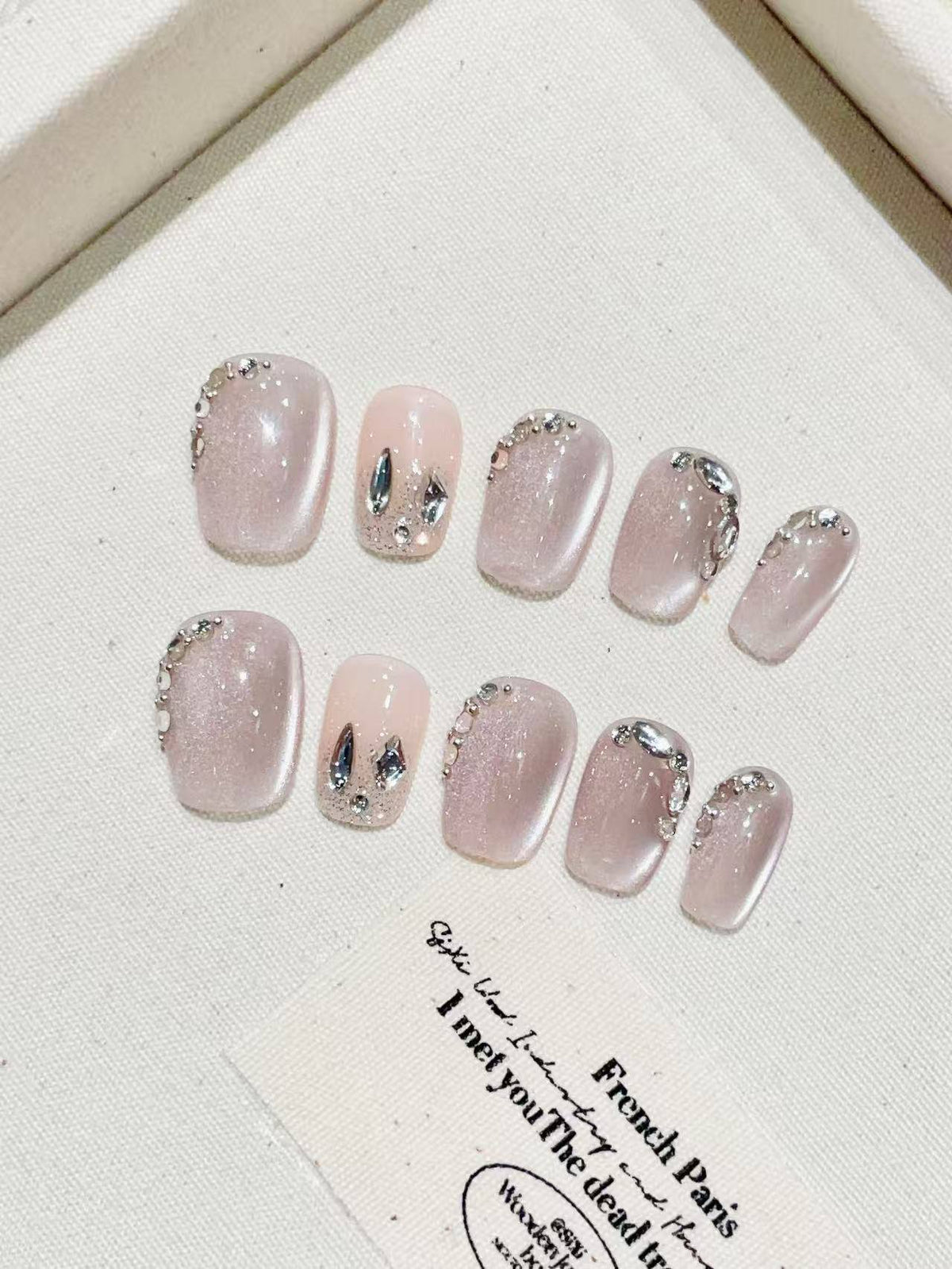 Blisss Nails Handmade Pink Nude with Cat Eye Effect & Taupe Rhinestone Press On Nails – Short Square Reusable Artificial Fake Nails with Glitter Accent | Premium Luxury Nail Art 10 pc Nail Set - S