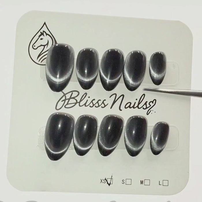 Blisss Nails Handmade Premium Press On Nails – Black Obsidian Velvet Halo Cat Eye Magnetic Effect, Reusable Artificial Nails, Short Almond Stiletto Shape, Luxury Shimmer Finish Salon-Quality False Nails 10 Pcs Nail Set - S