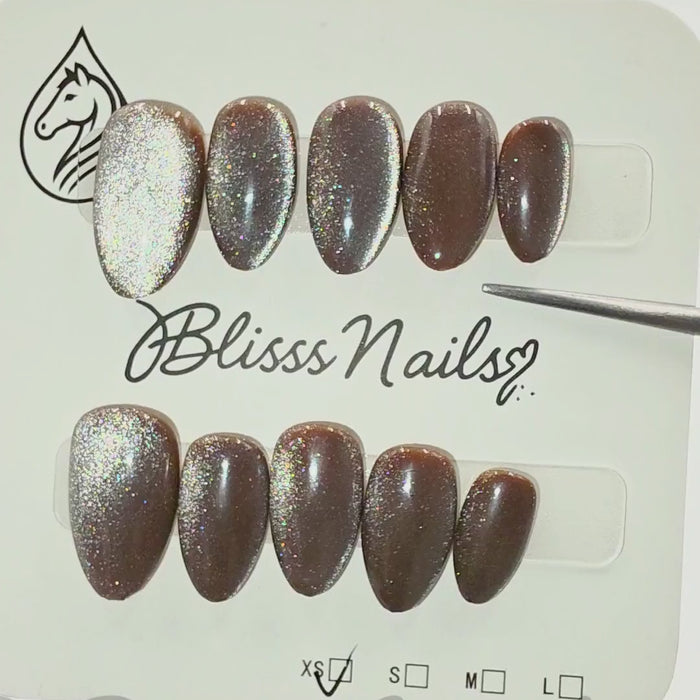Blisss Nails Handmade Premium Press On Nails - Deep Charcoal Grey Cat Eye Magnetic Effect, Reusable Artificial Nails, Short Almond Stiletto Shape, Luxury Shimmer Finish Salon-Quality 10 Pcs Nail Set - S