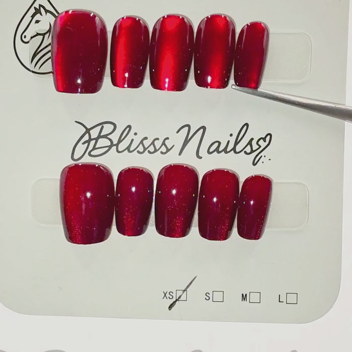 Blisss Nails Handmade Premium Press On Nails - Maroon Red Cherry Velvet Cat Eye Magnetic Effect, Reusable Artificial Nails, Short Square Round Shape, Luxury Shimmer Finish Salon-Quality False Nails 10 Pcs Nail Set - S