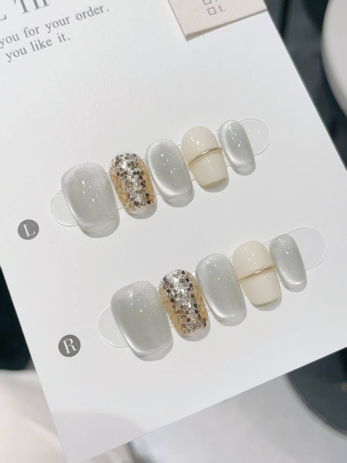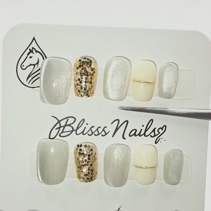 Blisss Nails Handmade White/Silver with Cat Eye Effect & Gold Glitter Press On Nails – Short Coffin Reusable Artificial Fake Nails | Premium Minimal Luxury Nail Art 10 pc Nails Set - S