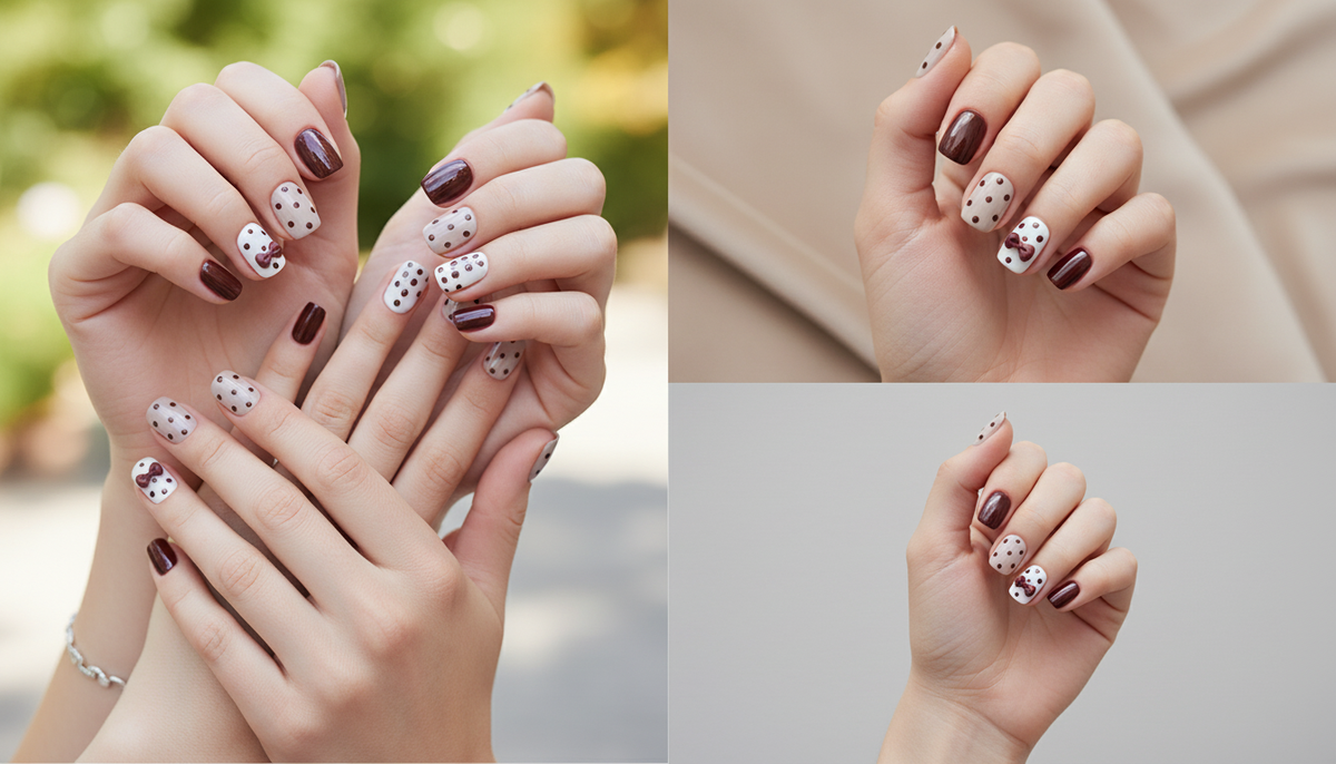 Blisss Nails Premium Handmade Burgundy Polka Dot Fake Nails – Short Square Artificial Reusable Press On Nails with Bow Accent for Women | Cute Salon Finish 10 pc Nail set - S